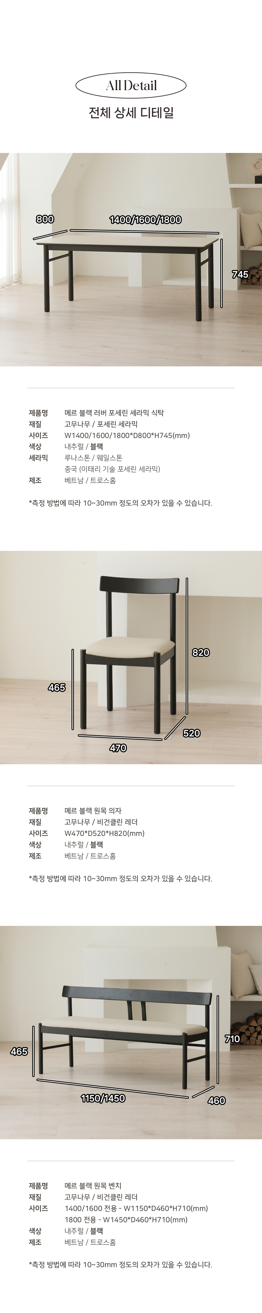 MER : 메르 블랙 러버 원목 포세린 세라믹 식탁 1400 1600 1800SALE